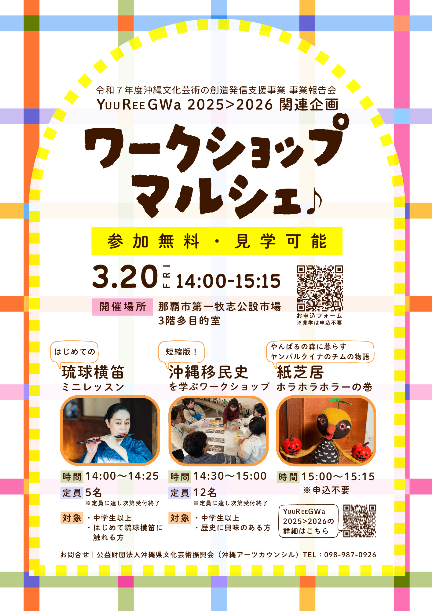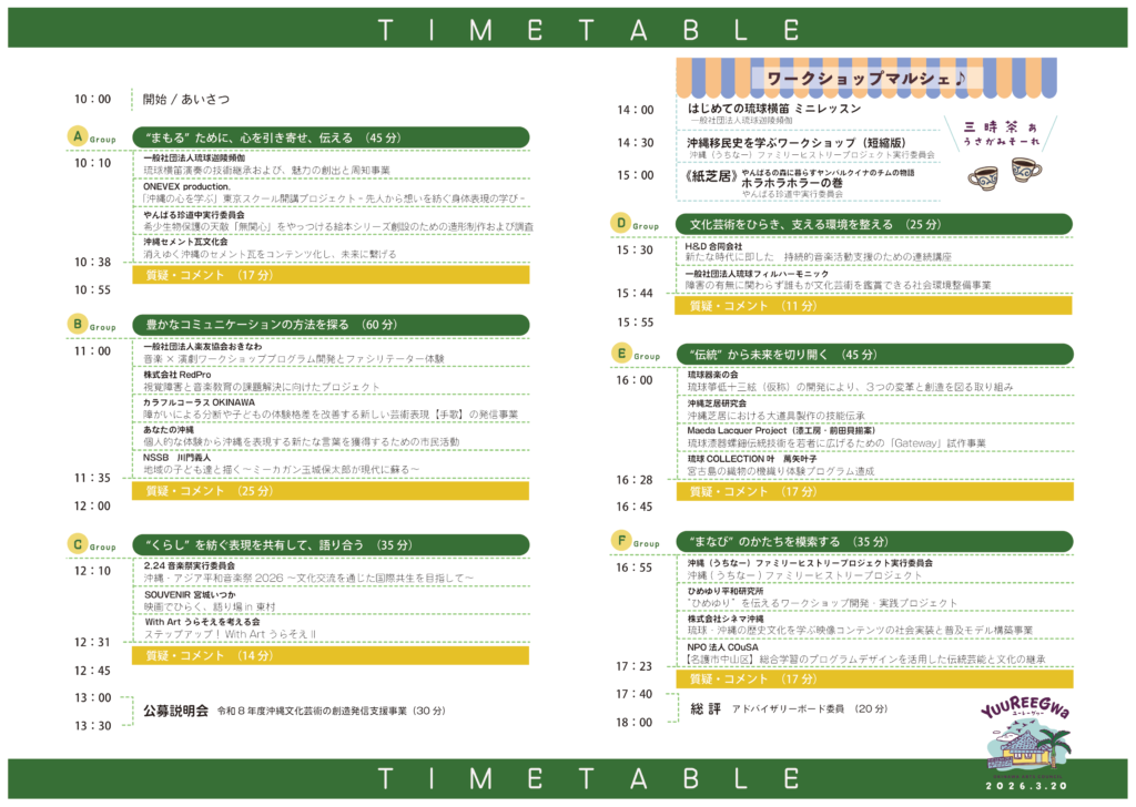 当日は、沖縄アーツカウンシルが支援した22の取り組み発表に加えて、さまざまな成果物を紹介するコーナーが登場します。さらに、関連イベント「ワークショップマルシェ♪」も開催します。