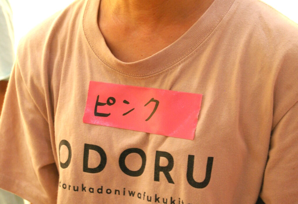 「あごら」に集まった、安里寿美さん、石川舞さん、宮城葉月さん、ピンクさん、邊土名俊毅さんの5人のプロジェクトメンバー。何が始まるのかまだ知らされていないなか、ひとまず名前がわかるようにと、胸元に大きな名札が貼り付けられた。