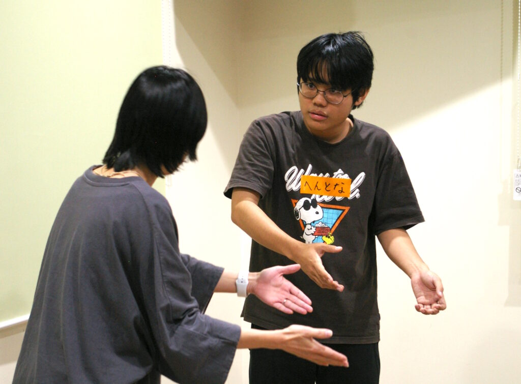 夏実さんが話していた実体験をもとに、「主人公はこういう人だ」と冒頭で伝える構成だ。このおかげで観客の理解が一気に深まった。さらに、邊土名さんと宮城さんが背中を合わせて180度くるりと回転することで、夏実さんが別人格と入れ替わる状況を表現すると、観客からは「お〜!」という感嘆の声が上がった。